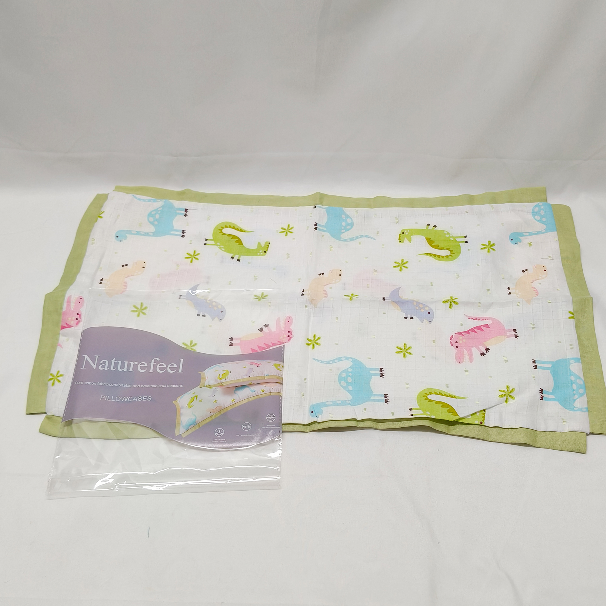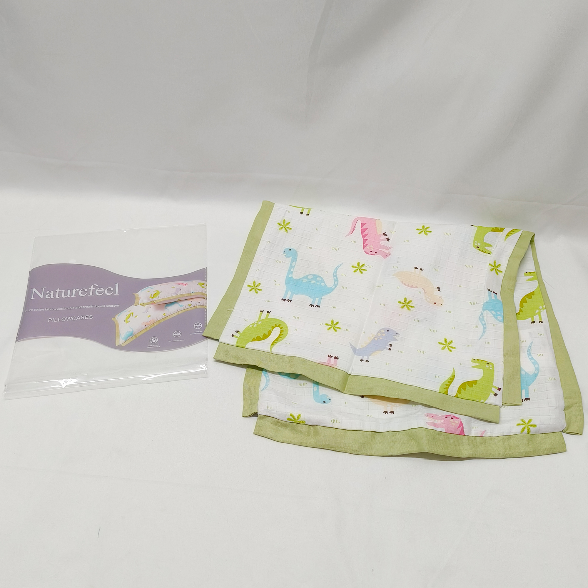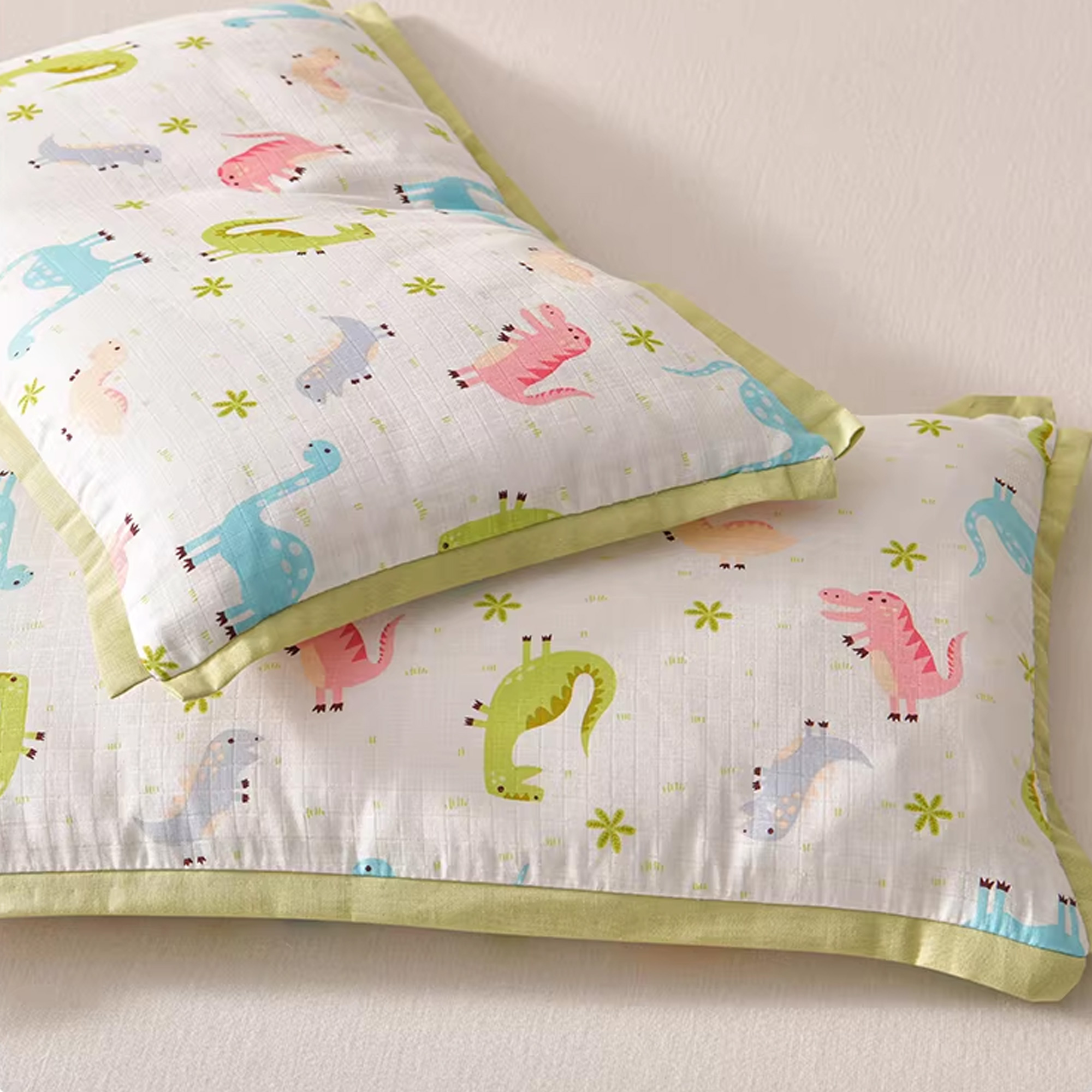 Naturefeel-Pillowcases,Muslin Pillow Covers for Soft Breathable Ruffle Edge Pillow Case with Envelope Closure Travel and Nursery Bedding Decor, Green Dinosaur.